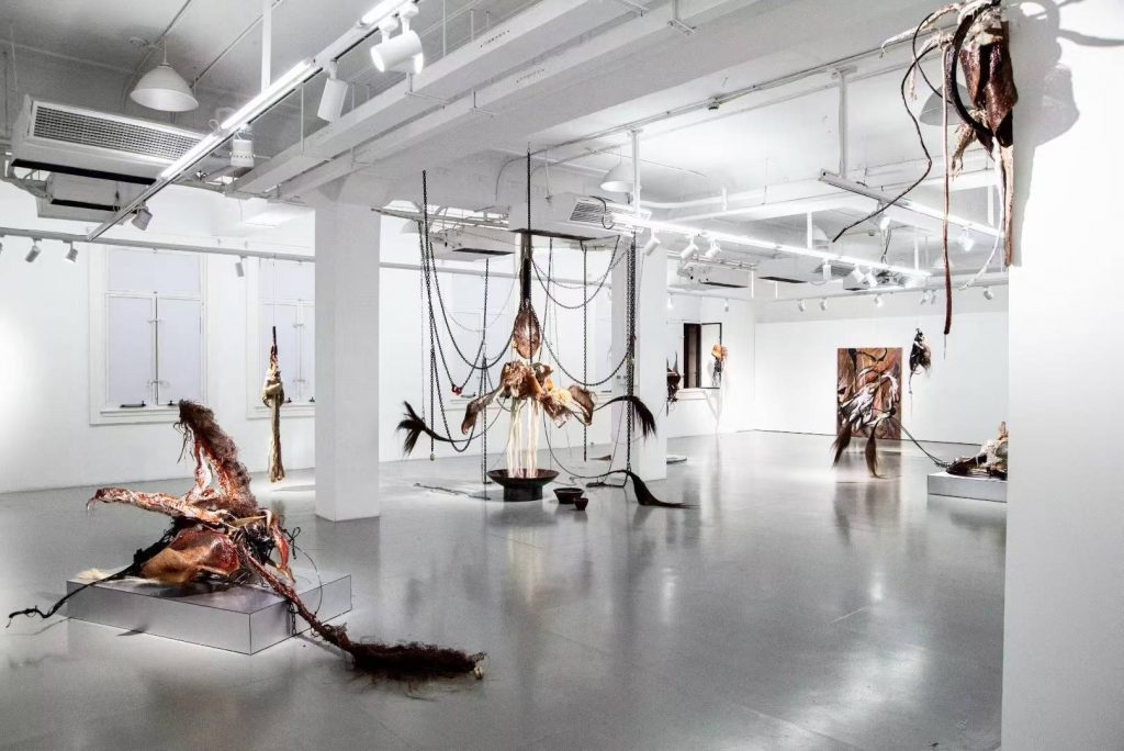 这件作品的背后,是四张大尺幅的绘画《 ACT 1/2/3/4 》,它们以一种动态生成的语言不断自我演化,充满冒险精神与偶发性,每一笔都如同在不可预测的生命路径中生长的意识碎片。这组绘画扩展了艺术家对“人性三重性”复杂共生关系的持续探讨。装置《露莎卡的声音》正倒卧于这组绘画之间,不再作为独立的主体,而成为画面的一部分。兽性的倒下,并非消亡,而是一种暴露与接纳,是艺术家借此回应那被遮蔽的欲望、冲动与深层本我。在这层意义上,《露莎卡的声音》既是一尊坠落的困兽,也是一面反映我们自身原初面孔的镜子。