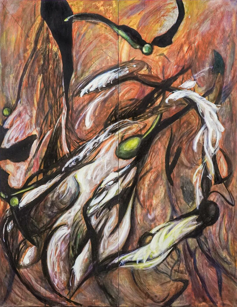 Behind this sculpture hangs a quartet of large paintings, ACT 1-4. These works employ a dynamic, generative language that perpetually self-evolves, embodying a spirit of adventure and serendipity. Each brushstroke resembles a fragment of consciousness taking root and growing along unpredictable life paths.