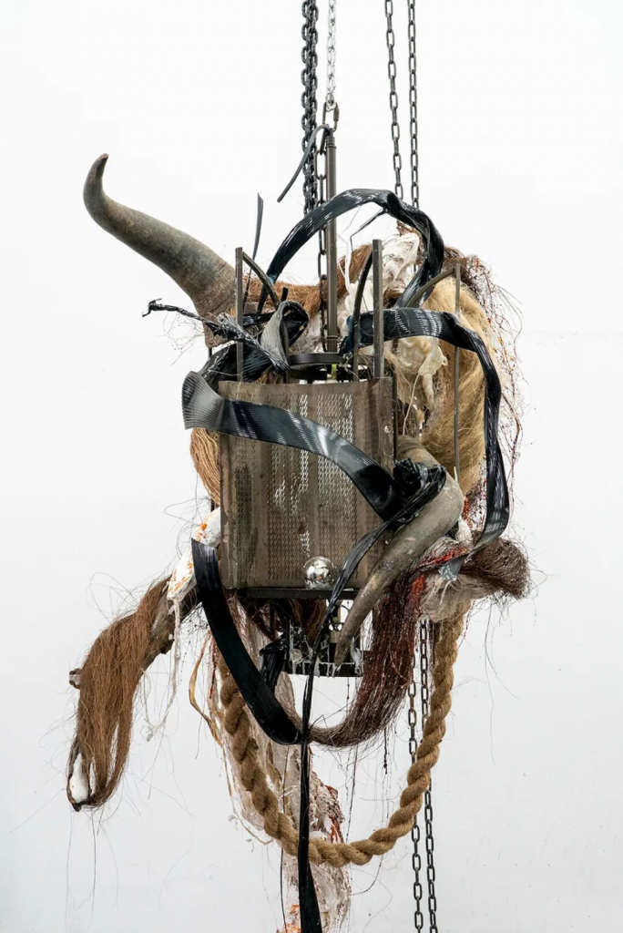 当观者的目光经过开场作品《搅乳海#1》(Samudra Manthan#1) 时,便与刘璇手中那根无形的金线悄然系在了一起。作品中绳索、轮环与垂坠结构的缠绕,不仅具象呈现了“人”的复杂性,也延续了她长期探索的“人性三重性” (Human Triplicity) 理论:圆环象征神性,头部代表人性,而装置背后垂落的“尾巴”则隐喻着兽性——三者交缠于一体,共构出一个持续转化的存在体。这一结构亦同时呼应了作品标题所引用的印度神话“搅乳海” (Samudra Manthan) 的原型意象。神话中,众神与阿修罗为了获得不死甘露而合力搅动混沌之海,这一过程既是创造也是分裂:混沌与秩序、光明与黑暗、牺牲与欺骗并存其中。正如搅动之力催生宇宙秩序,刘璇也借此暗喻人性内部的机制——我们所谓的“人性”,其实源自神性、理性与本能的持续拉扯与协商,它们并非二元对立,而是如神魔交织般,处于一种不稳定的共生状态。她将这一神话原型转译为装置结构语言,并引导观者进入一场自我内部的“搅动”:刘璇并不试图用神话去讲述过去,而是借它激活观者此刻对“内在自我”的感知。那根交到观者手中的“金线”,既是连接艺术家与观众的媒介,也是引领他们进入自身内在剧场的路径。