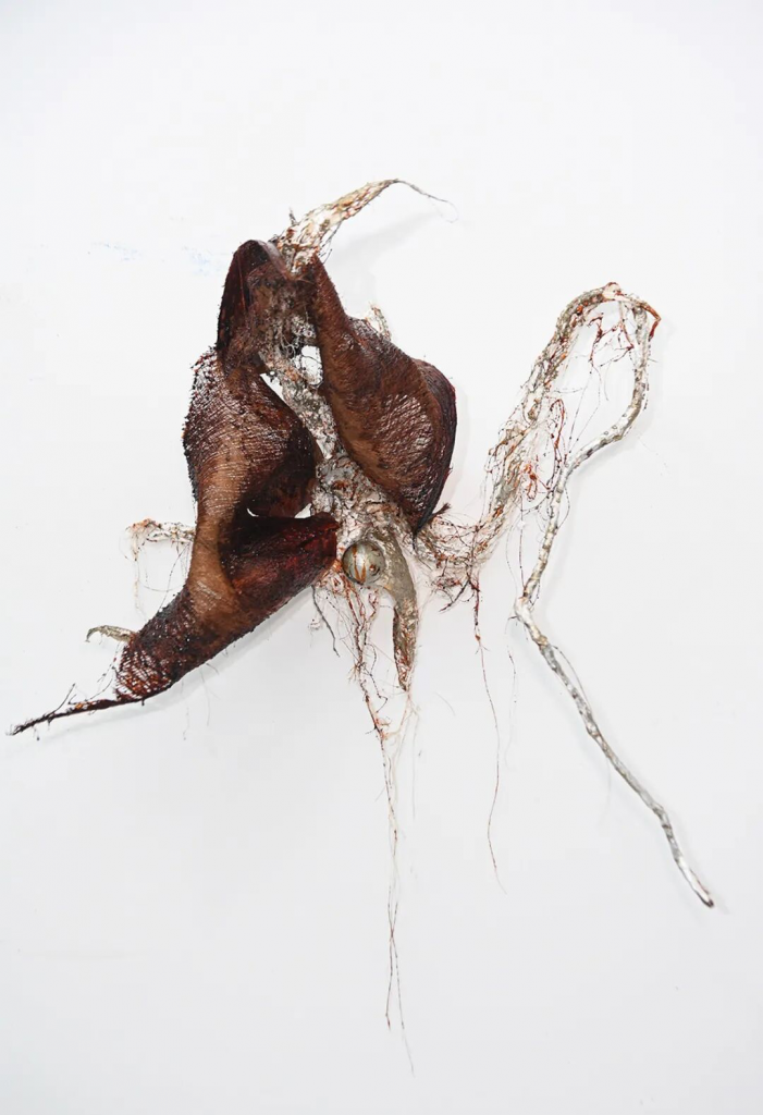 As the viewer’s gaze falls upon the opening work, Samudra Manthan #1, it becomes quietly tethered to the invisible golden thread held by Liu Xuan. The intricate entanglement of ropes, rings, and pendant structures not only gives tangible form to the complexity of the human condition but also embodies her long-explored theory of “Human Triplicity”: the circular ring symbolises divinity, the head represents humanity, and the trailing “tail” gestures toward bestial instinct. These forces entwine to form a continuously shifting being.
